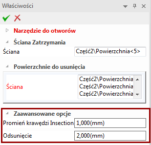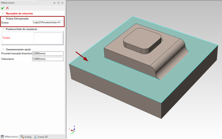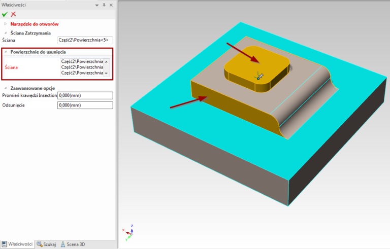 - Selectați una sau mai multe fețe ca suprafețe ce urmează să fie îndepărtate. Dacă nu doriți să îndepărtați pereții în momentul aplicării instrumentului pe tablă, nu trebuie să selectați nicio geometrie în această fereastră.
